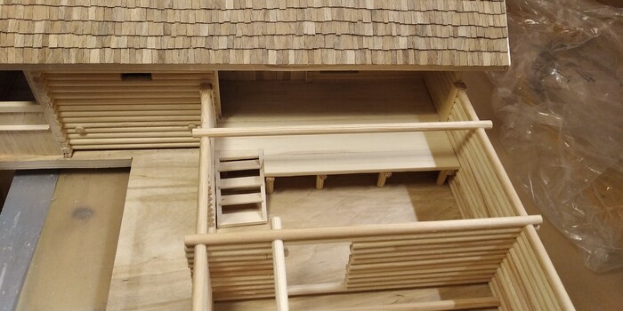 Оформил лёгкие перегородки на мостичкЕ - те, что отделяют холодную кладовку и туалет. Настелил пол в хлеву. А потолок его набрал из более тонких 5-мм галтелей.