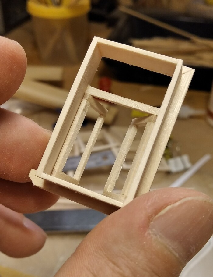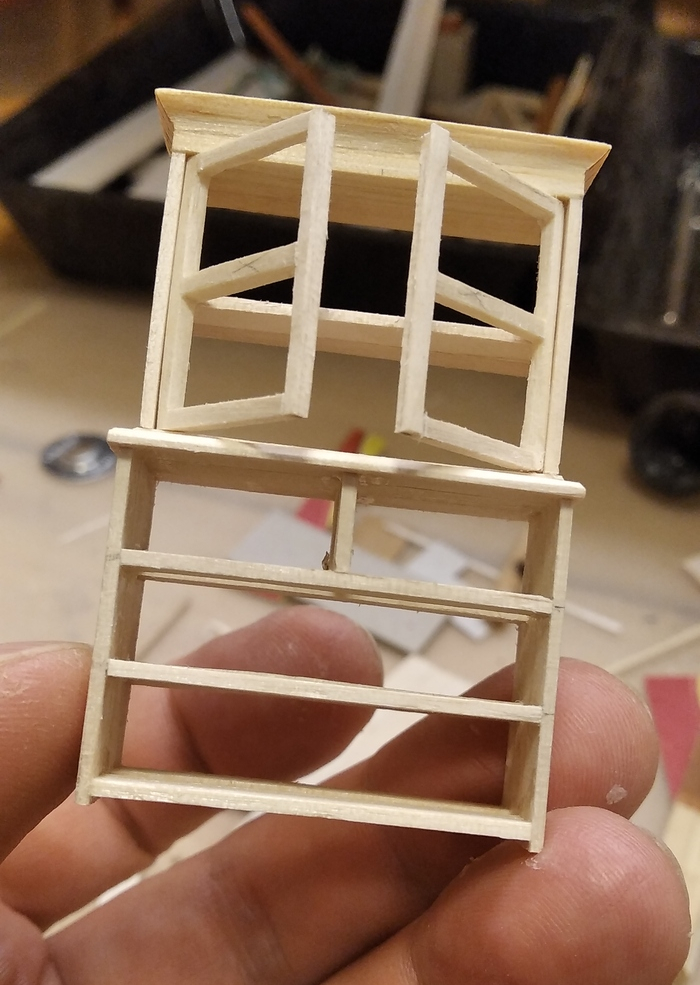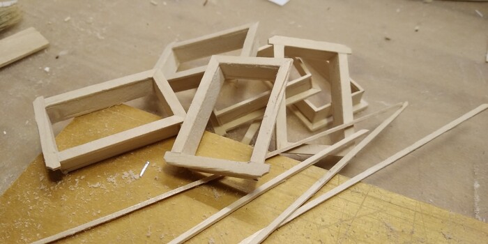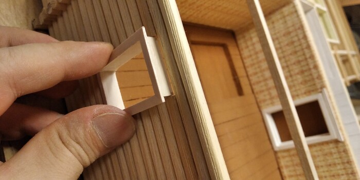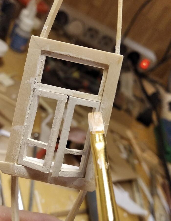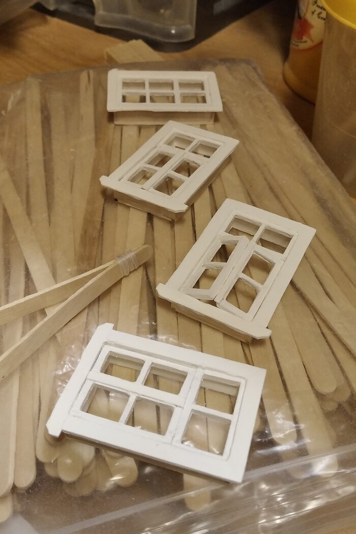 Сначала склеил коробки, потом вставил подвижные рамы. Из двух отбракованных палочек сделал зажим, с помощью которого удобно красить окна.