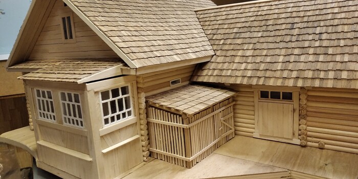 В деревне рядом со двором стоял сарай-сеновал. В него краем упирался другой забор, с калиткой в огород. Поэтому и без сарая обойтись, вроде как, нельзя... и сарай если ещё ставить, то макет станет уже совсем громоздким. Как быть? Нашел решение: сарай, вроде, ещё только строят. А "строящийся" сруб вполне реалистично можно "обрезать" по границе подмакетника.