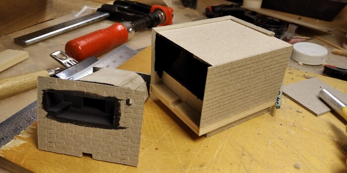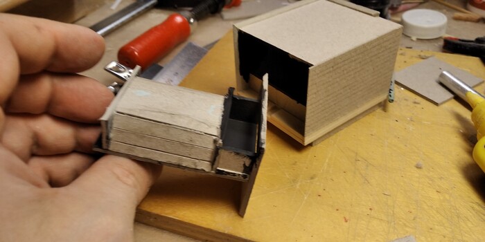 Поэтому сначала сделал каркас из модельного картона. Покрасил его в матовый чёрный цвет и обклеил маленькими кусочками-торцами "поленьев".