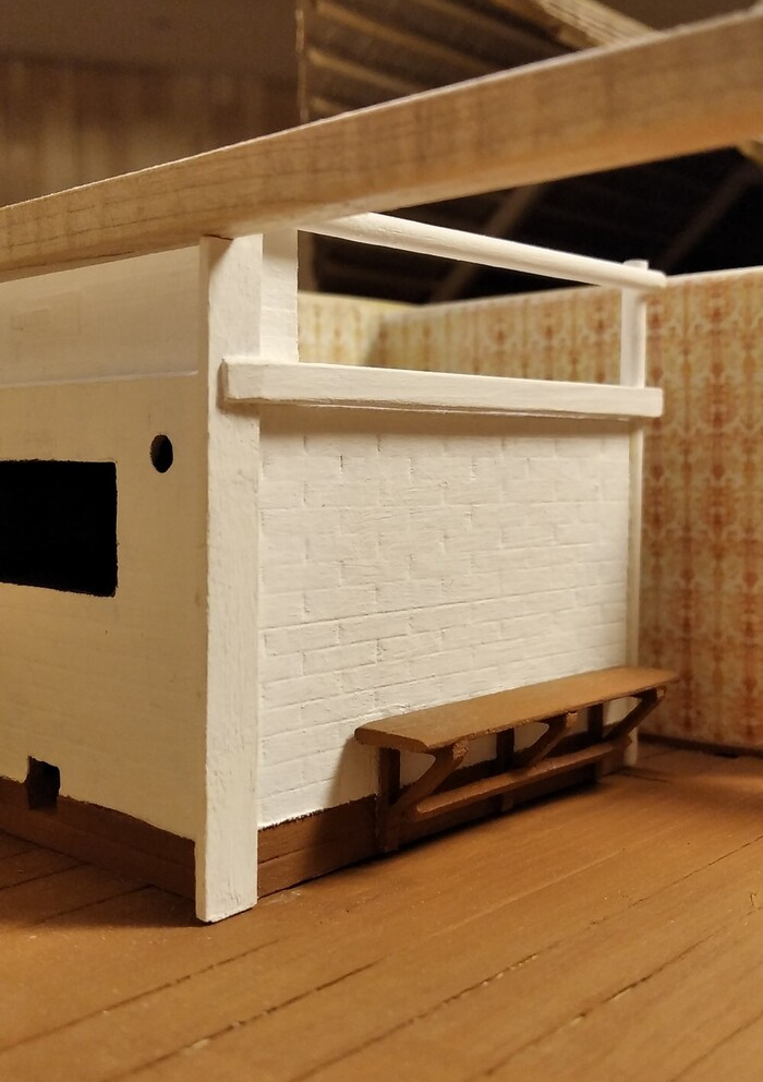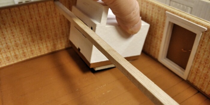 После обоев и пола приклеил крашеные "плинтуса". Тут пригодились отбракованные кривые палочки - в качестве распорок-прижимов.