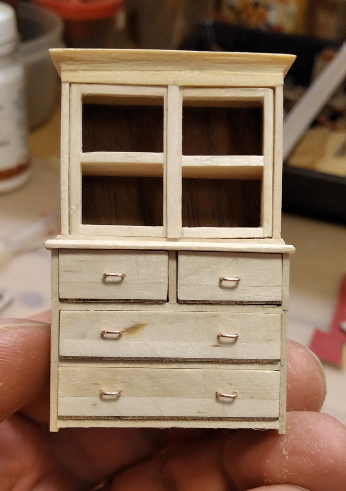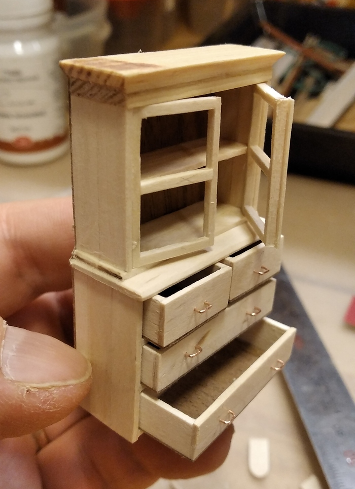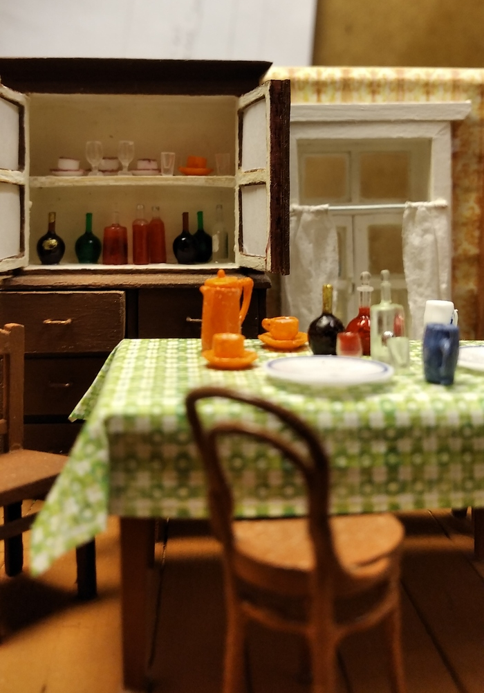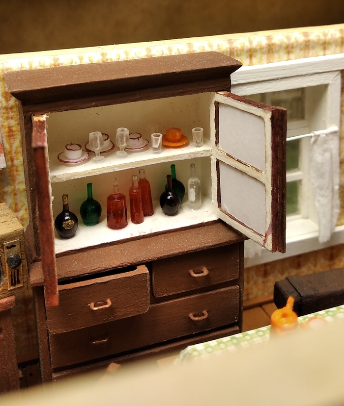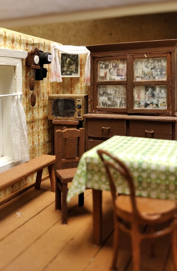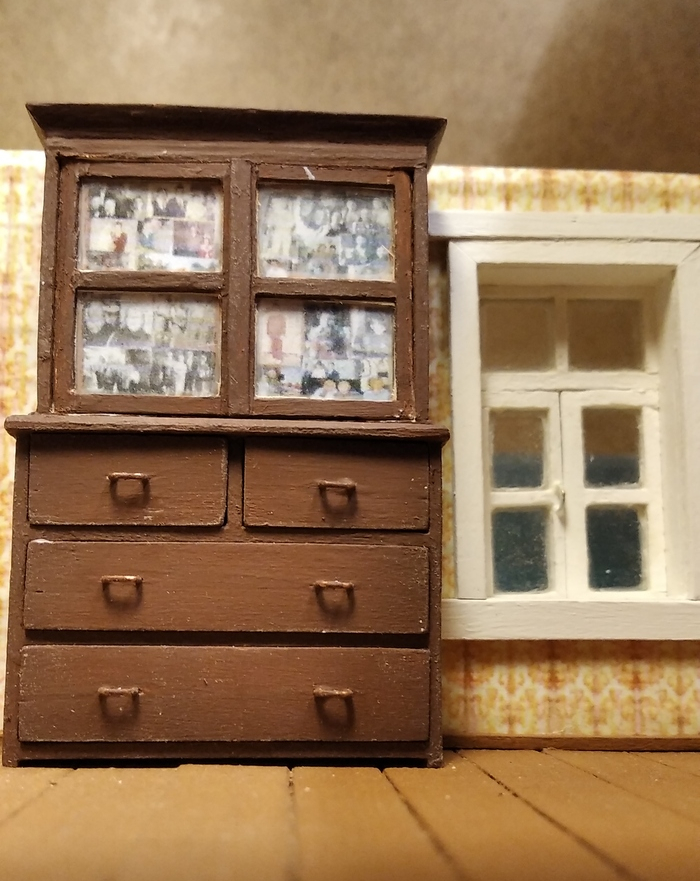 Комод-буфет был центральной "доминантой" комнаты. Там хранилась парадная посуда, а на дверках был выставлен "иконостас" из семейных фотографий (его тоже "вырезал" на компьютере с фотографии). Стенки и ящики комода широкие, поэтому сделал их уже не из палочек, а из деревянных медицинских шпателей. Посуда - из готового набора.