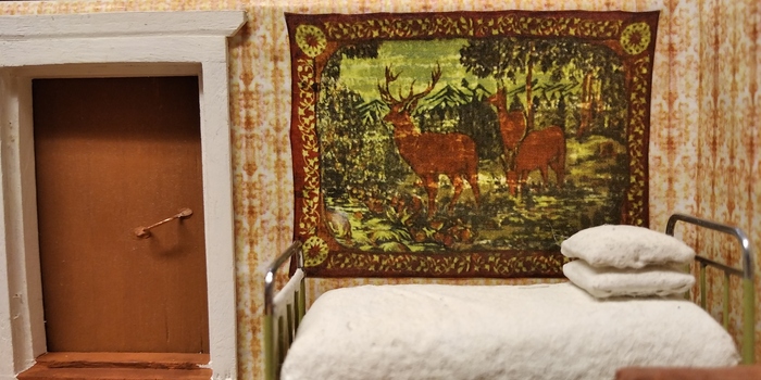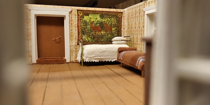 Кровать здесь уже другая по форме. Собирал тоже из скрепок на пайке. Только угловые стойки с набалдашниками сделал из четырех финишных гвоздей - "шляпка" у них нужной округлой формы, да и толщина подходящая. Увы, процесса сборки опять не заснял...
