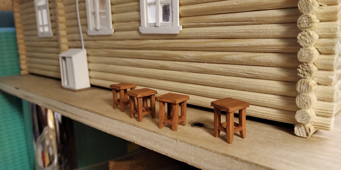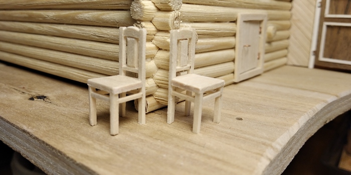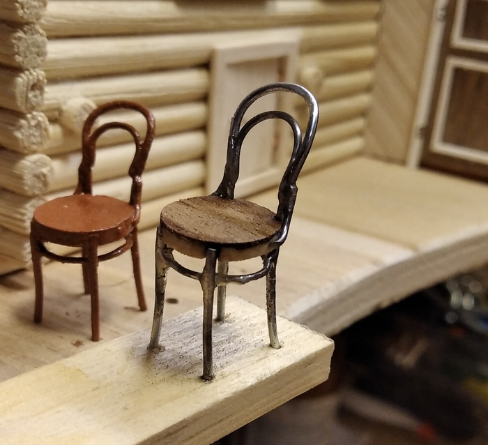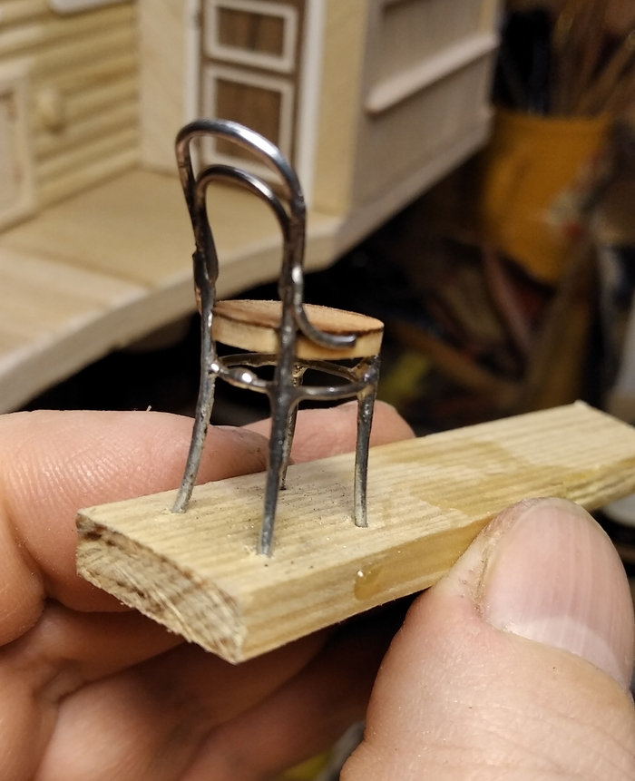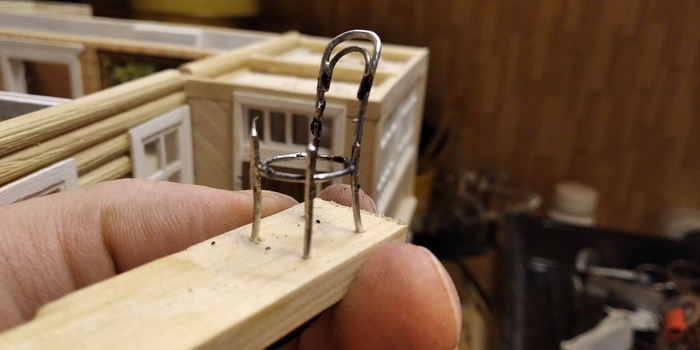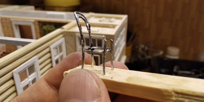 Другой непременный атрибут деревенского дома - венские стулья. Их тоже делал из толстых скрепок. Для облегчения пайки, закрепил ножки в бруске.