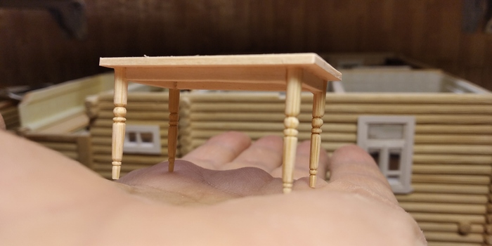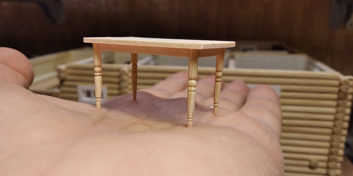 Ножки у этого стола были уж очень точёные и этим очень приметные. Поэтому пришлось их точить и здесь, закрепляя круглые заготовки в цанге гравёра.