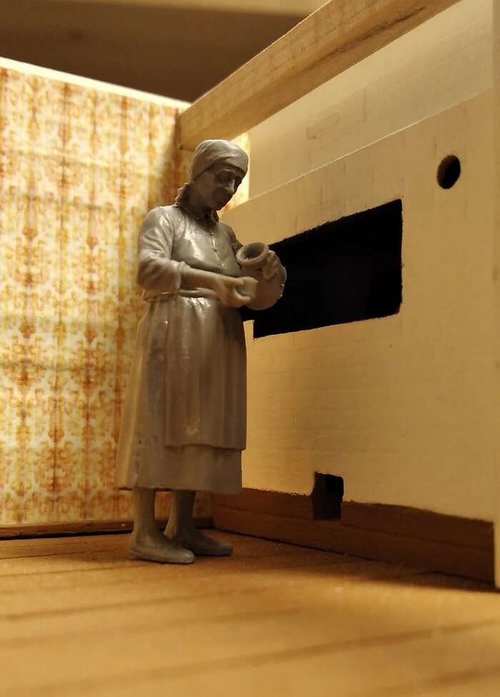 И вот уже можно через окошко "подсмотреть" как печка будет выглядеть в интерьере дома... и с его обитателями. :-)