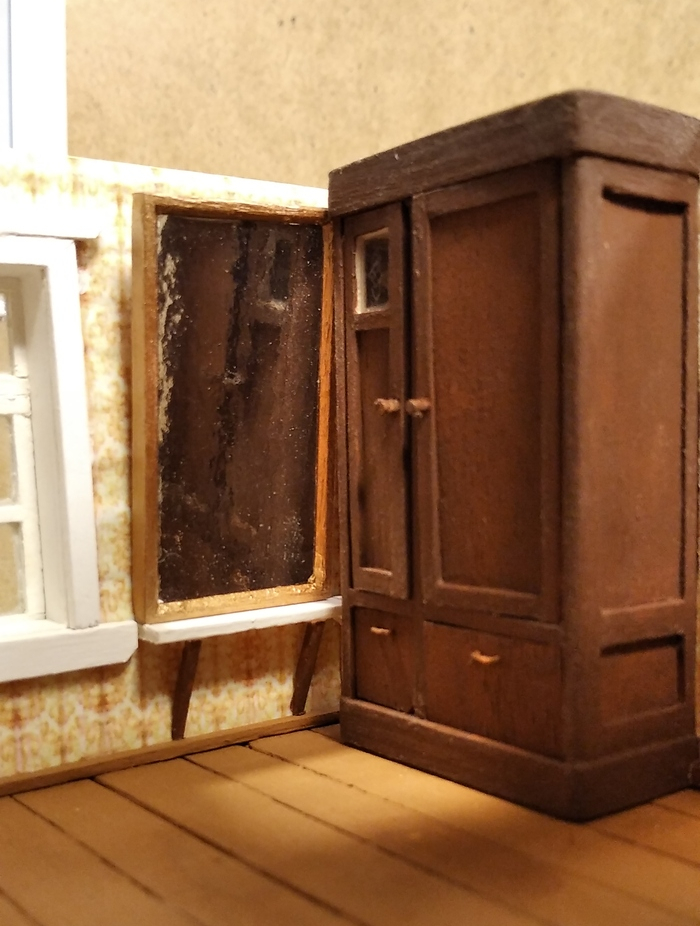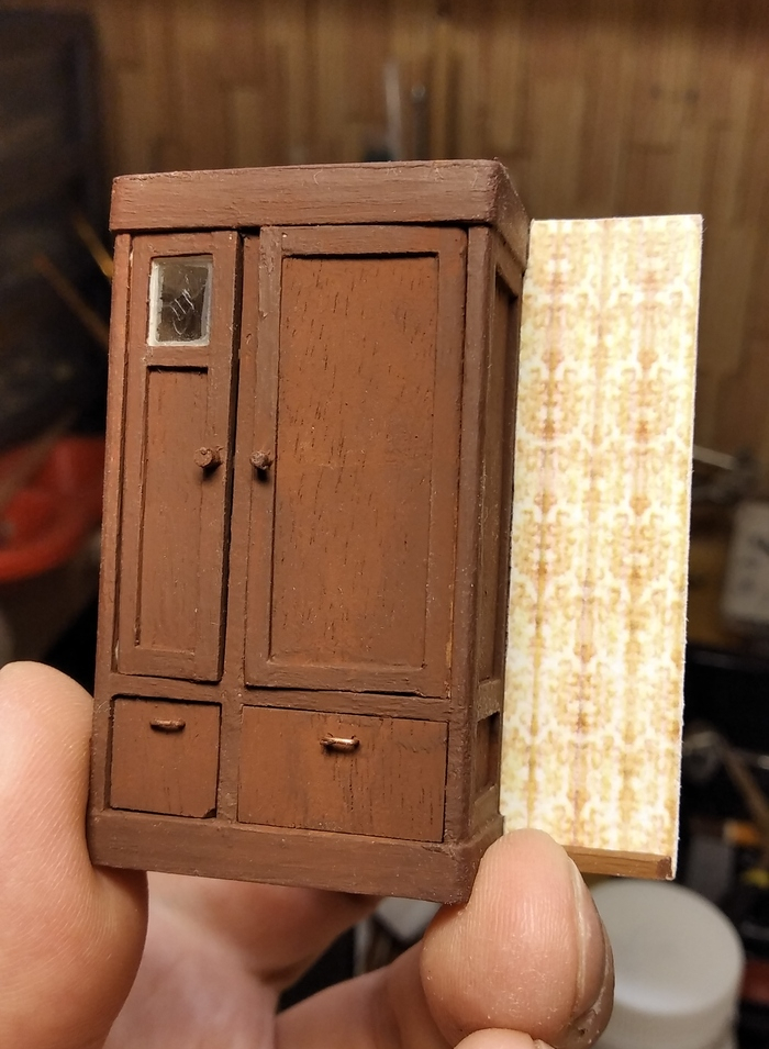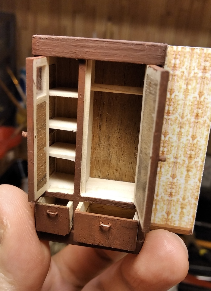 Шкаф, как и печку, не приклеивал к полу, а закрепил на двух штырях - чтобы можно было снимать при необходимости.