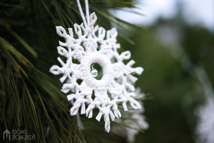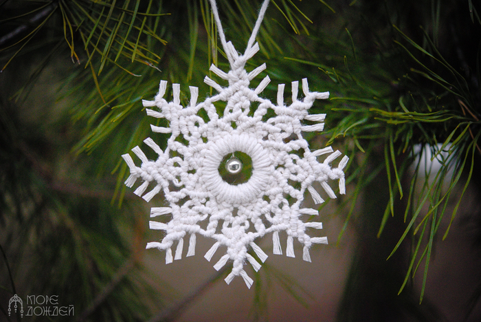 Тут всего два вида схем снежинок, но все вместе смотрятся вполне богато. Хотя вариантов, которые можно сплести, ещё очень и очень много. К следующему году буду делать наборы и расширять ассортимент ёлочных игрушек. Когда начинала плести макраме на ёлку, не ожидала, что получится так эффектно.