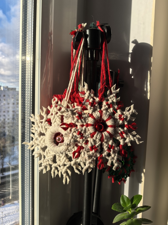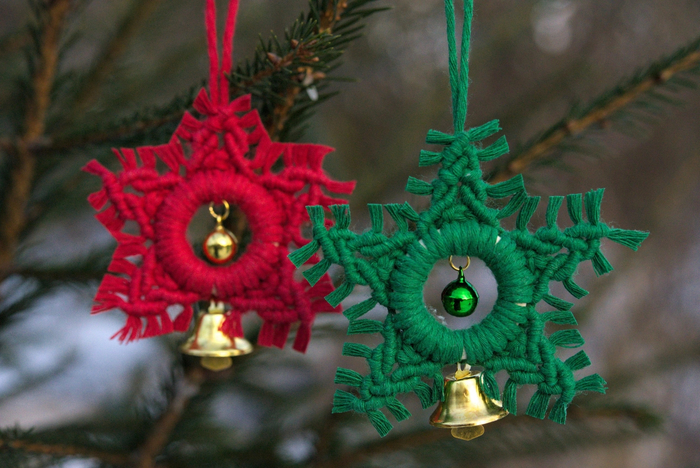 Покажу не только результат, но и несколько процессных фото. Даже удивительно, насколько кракозябристо это все выглядит, пока не обрежешь ровно нити и не повесишь бубенчик с петелькой.