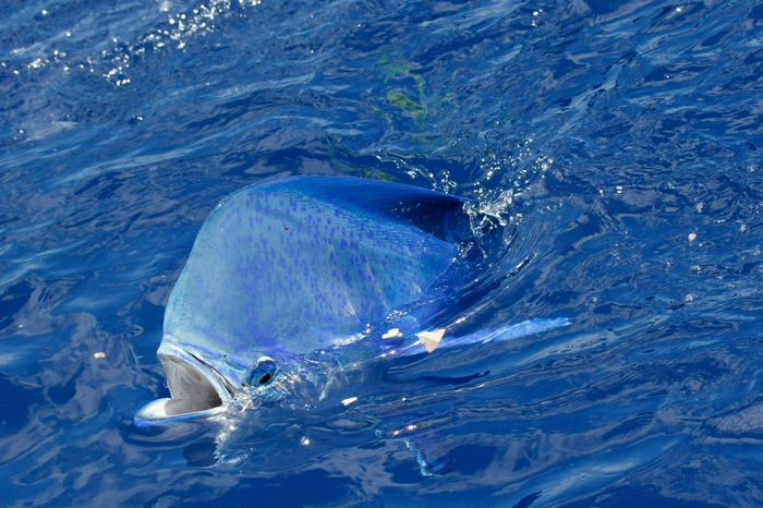 Начнём с большой корифены. Что ж, с определением размера рыбы не ошиблись, балда вырастает в длину до 2 метров и весит до 20 кило. Сюда же относится и название махи-махи. Это имя дали ей на Гавайях, и оно означает «очень сильная». Несмотря на солидные габариты, рыбина развивает скорость в 70 км/ч — она входит в десятку самых быстрых рыб планеты! А теперь представьте, с какой мощью она рвёт леску, когда пытается вырваться, и поймёте, что описать это другими словами, кроме как «очень сильно» — не получится.