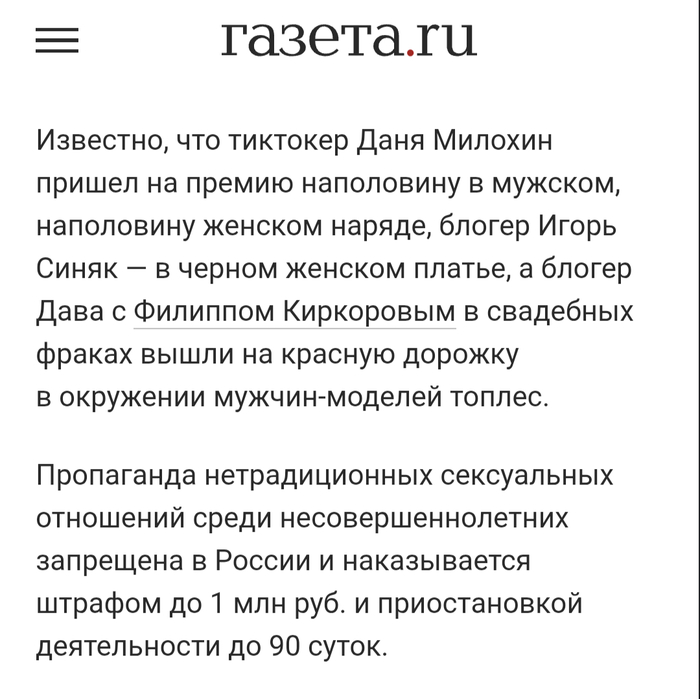 Роскомнадзор оштрафуй РТ за то что показывает дороха в женском платье. И самого дороха желательно проверить на ЛГБТ пропаганду. Если не будет хотя бы проверки со стороны ркн, значит закон направлен только против конкретных людей.