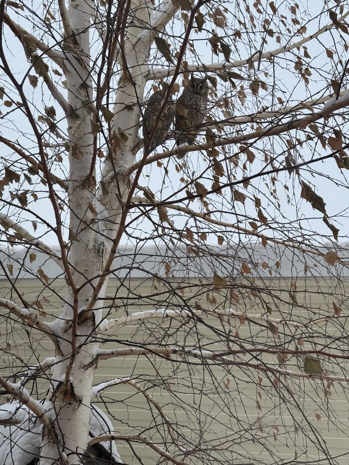 Я написал орнитологу одному местному (видел его в INaturalist), знает ли он, куда можно обратиться. Через минут сорок он вошёл в сеть и скинул контакты местного центра спасения хищных птиц. Пишу девушке из центра. Она объяснила, что мне надо найти большую коробку, посадить сову туда и утром отнести к ним. Проинструктировала, как сове устроить ночь в квартире, что можно и что нельзя делать. Сова всё это время сидела в сугробе и вертела башкой.