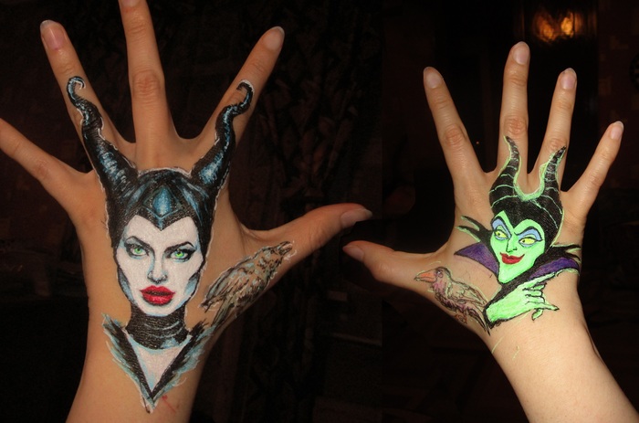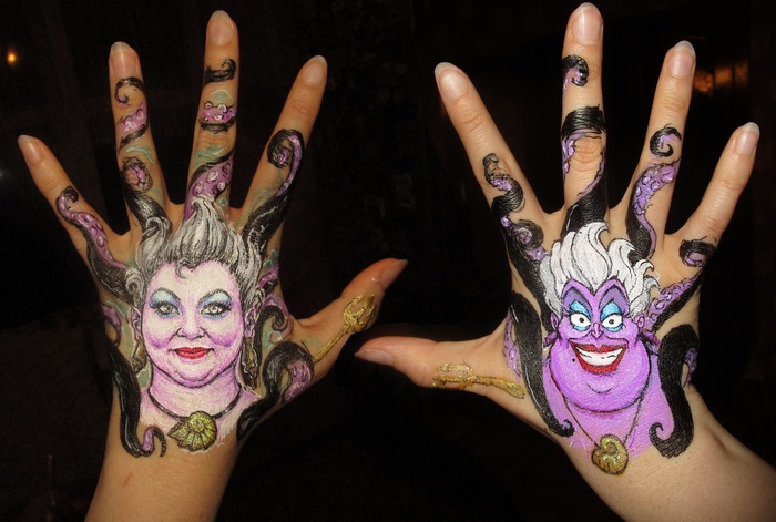 Устроила себе квест с изображением портретов необычными материалами или на необычных материалах. На этот раз пытаюсь рисовать своими обеими руками на своих обеих руках. В тему Хэллоуина пусть это будут портреты диснеевских злодеек из фильмов плюс их мультфильмные прототипы. Фильм про русалочку правда ещё не вышел, так что Мелисса Маккарти тут не прям реальная Урсула, а только моя жалкая попытка её в этом виде изобразить (надеюсь у Диснея Урсула выйдет получше, ибо у меня вышла какая-то Галя из "Пятерочки" или Тамара Ивановна из бухгалтерии "Пятерочки").