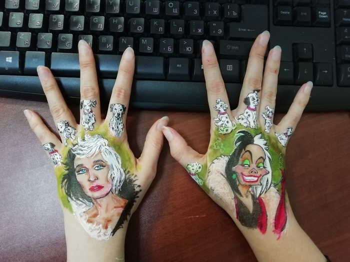 P.P.S - с Круэллами я сегодня лоханулась и не успела их вовремя доделать дома. Поэтому пришлось с разрисованными руками идти на работу и доразрисовывать их прямо там. Короче некоторые на Хеллоуин наряжаются в костюм Эдварда-Руки-Ножницы, а я была в костюме Женя-Руки-Круэллы :)