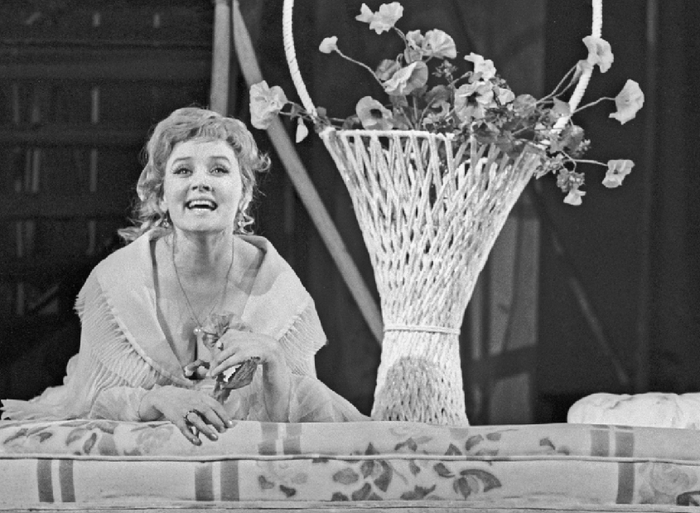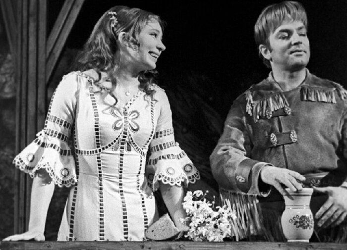 На этой фотографии 1971 года – молодая актриса Татьяна Васильева со своим коллегой Михаилом Державиным в спектакле Театра сатиры «Обыкновенное чудо». Она окончила актёрский факультет Школы-студии МХАТ в 1969 году и тогда же пришла в этот театр, где проработала до 1983 года. А в следующем году состоялся ее дебют в кино – в фильме «Всмотритесь в это лицо».