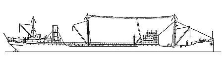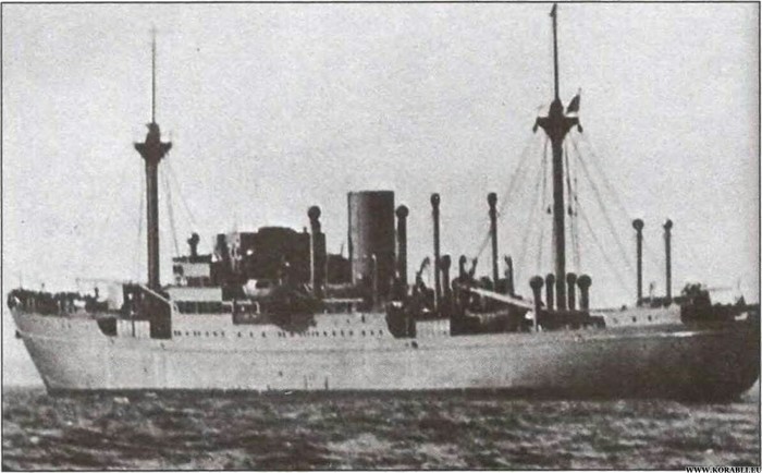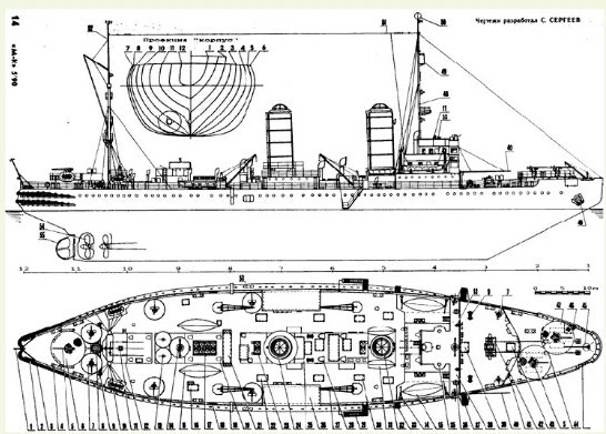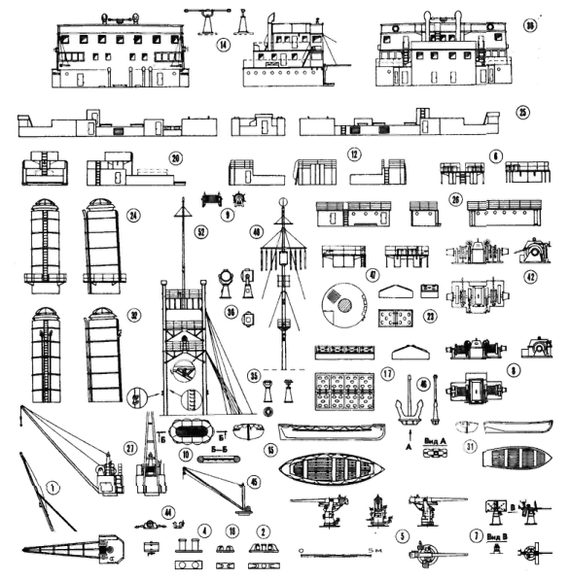 Ледокол “А. Микоян” (по состоянию на 1942 г.): 1-- кормовой флагшток, 2. 18 - киповые планки, 3—кормовой кранец, 4 - кнехт, 5 - 76-мм орудия, 6—площадка кормового орудия, 7 20-мм авюматы. 8- буксирная лебедка. 9- вьюшки для тросов. 10- спасательный плотик, 11—компасы, 12--кормовая надстройка, 13—пулеметы, 14—дальномер, 15—спасательные шлюпки, 16, 21, 22, 30—крышки люков угольных ям, 17 световой люк машинного отделения, 18— мусорный рукав, 20— надстройка машинного отделения. 23— световой люк котельного отделения. 24 задняя дымовая труба, 25 -надстройка котельных отделений, 26 - бортовая надстройка, 27 кран грузоподъемностью 3 т, 28 вентиляционный дефлектор, 29—забортный трап, 31 рабочая шлюпка, 32 -передняя дымовая труба, 33- площадка для научных целей, 34 шлюпбалка, 35 — штурманский пеленгатор, 36 - прожектор, 37 - логовая площадка, 38— носовая надстроика, 39, 43- крышки грузовых люков, 40— грузовая стрела, 41—волнолом, 42—брашпиль, 44—стопор якорной цепи, 45 - грузовая стрела для подъема якорей на верхнюю палубу. 46 якоря, 47— площадка носового орудия, 48—фок-мачта, 49- “воронье гнездо”, 50 радиопеленгатор, 51 радиоантенна, 52 грот-мачта, 53 поргик спасательных шлангов, 54 четырехлопастпыи гребной винт, 55 перо руля.
