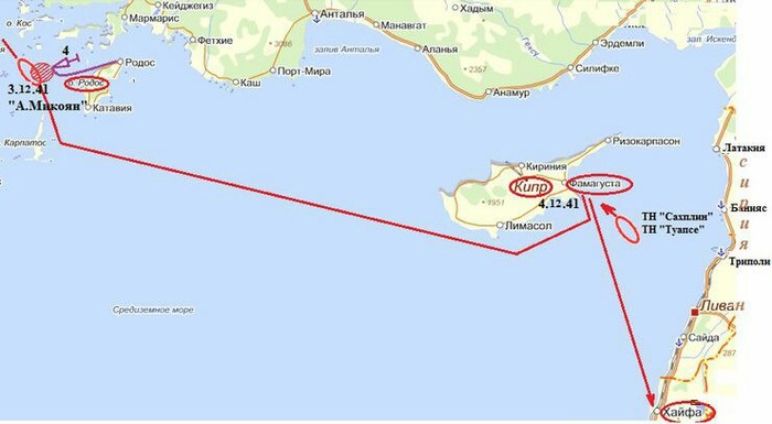 Как только утром 4 декабря показались берега Кипра, навстречу устремились английские эсминцы с наведёнными орудиями. Старший лейтенант Хансон связался по радио со своими кораблями и вскоре всё разъяснилось. Оказалось, что радиостанции Берлина и Рима уже успели сообщить на весь мир об уничтожении крупного советского ледокола. Поверившие этому сообщению, англичане приняли ледокол за корабль противника. В том, что советская авантюра с прорывом кончиться неминуемой гибелью всех четырёх судов, англичане не сомневались ни минуты. Поэтому никак не ожидали увидеть ледокол. В сопровождении эсминцев «Микоян», пройдя более 800 миль, прибыл в Фамагусту. На ледокол было страшно смотреть. Высокие трубы обгорели, из многочисленных, наспех заделанных пробоин струился дым. Ходовой мостик и надстройки изрешечены пробоинами. Борта испятнаны оспинами попаданий. Верхняя палуба, покрытая тиковым деревом, засыпанная гарью и сажей, была почти черной. Задание ГКО по прорыву на Кипр было выполнено. О чём через Лондон было сообщено в Москву.