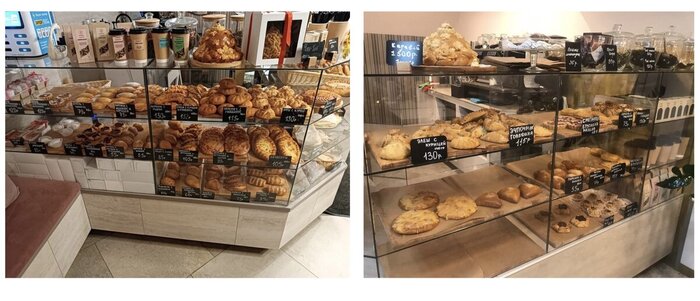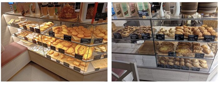 1. Оборудование для выпечки можно поделить на два типа: витрины цельным блоком со стеклянным куполом и витрина в несколько уровней с наклоном полочек. Последний вариант подходит для заведений с широким ассортиментом и большим товарным запасом. Такое оборудование можно увидеть в булочных «Ф. Вольчека» или «Люди любят хлеб». На третьем коллаже наша витрина в три уровня, без наклона.