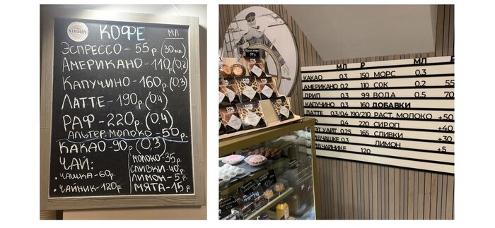 К сожалению, заранее также не было выделено место для меню. Помимо наборного меню сейчас существуют десятки вариантов, но нам сильно усложняли ситуацию низкие потолки. Количество проданных стаканчиков кофе в день напрямую зависит от того видят гости меню или нет. Изначально была только маленькая меловая доска. Я предложила заказать наборное меню, но это решило проблему лишь отчасти. Размещать меню сбоку от посетителей не самый удачный вариант, но единственный.