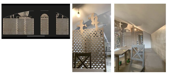 В идеале зонированием тожедолжен заниматься дизайнер, но бывает по разному. :) Я уже упоминала ранее, что одна из наших пекарен располагалась в одном помещении с магазином, поэтому вопрос зонирования был принципиальным. В этом помещении было принято сделать деревянные перегородки с национальными мотивами. На мой взгляд, этот элемент был реализован успешно. Фотографии были сделаны на этапе ремонта.