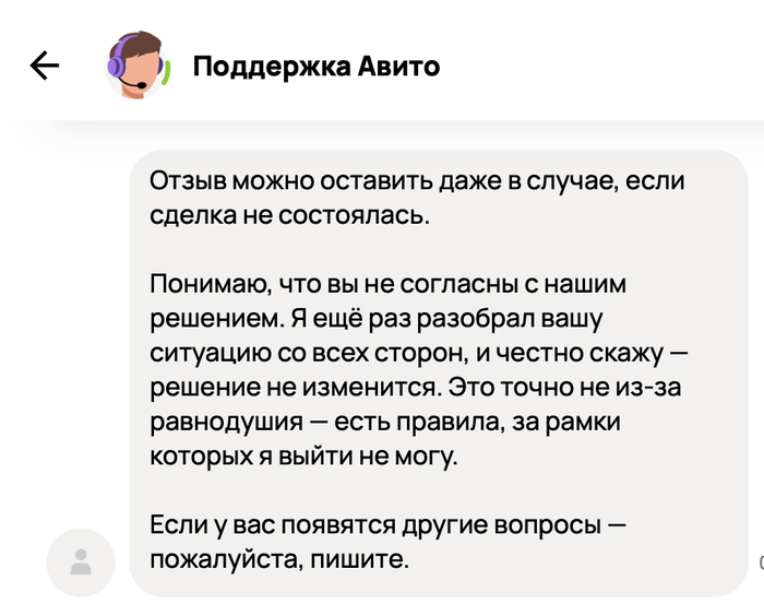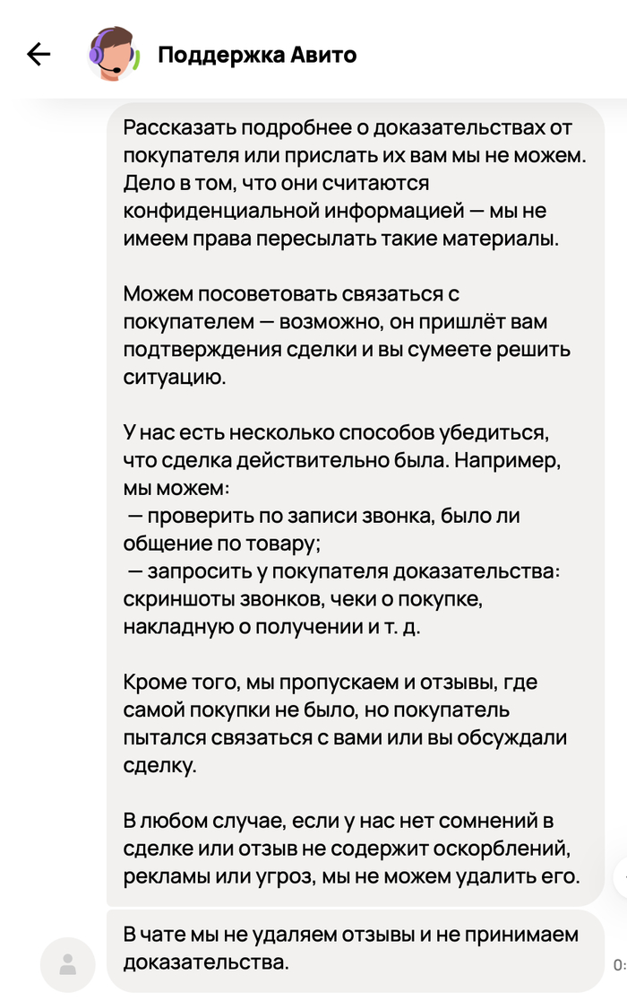 Подтверждение от Авито, что нет переписки