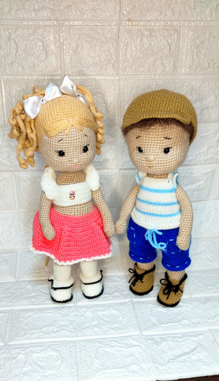 Попросили в подарок связать такого вот мальчика, до этого я подарила куколку им. Переживала,что не получится, так как вязала без описания. Одежду тоже сама вязала и по ходу примеряла, даже не пришлось распускать, получилось сразу как надо. Ну и ещё этот же заказчик заказал для своих коллег две пляжные сумки, фото будет позже, я эти сумки так же вяжу по фото и каждый переживаю,что не получится ))