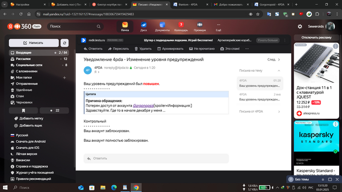 Чтобы связаться с администрацией я создал второй аккаунт под ником Gorgonopsid, для связи. Написал о своей проблеме в раздел Коллекция плохих отзывов о 4pda.ru . Через буквально полчаса мне на почту, с которой я прошёл регистрацию, пришло уведомление "Ваш аккаунт заблокирован. Вам доступен только раздел "Последний шанс"."