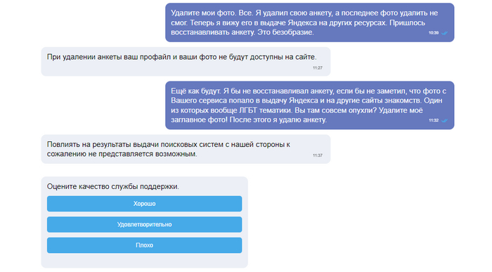 Второе странным - пришла девушка на 40кг (в лучшем случае) больше фотки и с кучей проблем с финансами, кредитами, здоровьем и психологией. Короче девушке нужен был спаситель, а не парень и это был не я. Вежливо сказал как есть: что я не готов её тянуть и мне нужен партнёр, а не объект для спасения, пожелал удачи.