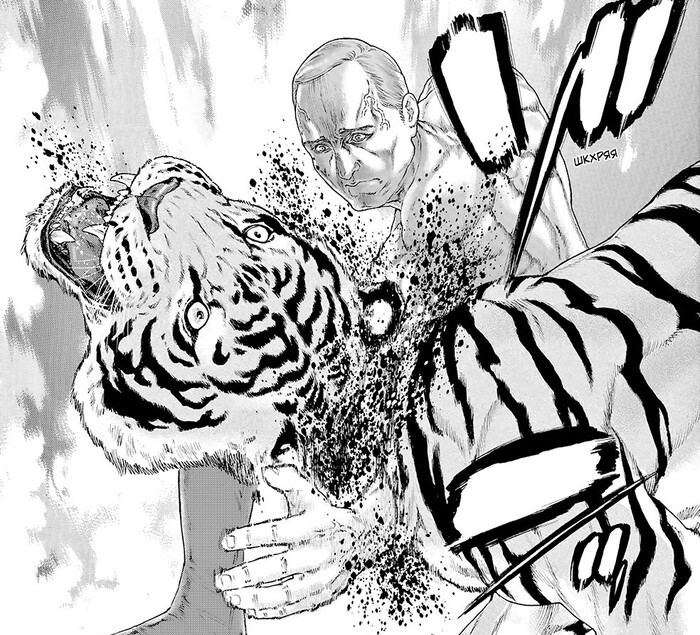 Говоря о разных зверях, необходимо, конечно же, упомянуть рисунок. Мангака Баба Ясуси имеет за плечами не много работ. Его самая продолжительная и знаменитая манга - это «Принц Карате» (2000) и насчитывала она более 50-ти томов. К слову, Путин уже появлялся на страницах работ мангаки, так, например в «Golosseum»(2015) мы могли лицезреть Владислава Путинова. Так что мангака явно питает симпатию к этому персонажу.