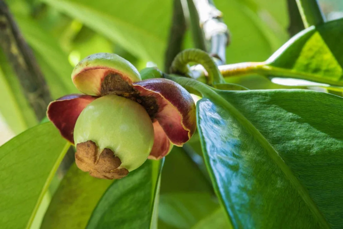 И у Ивана Александровича Гончарова: «Утром рано стучится ко мне в каюту И. И. Бутаков и просовывает в полуотворенную дверь руку с каким-то темно-красным фруктом, видом и величиной похожим на небольшое яблоко. «Попробуйте», — говорит. Я разрезал плод: под красною мякотью скрывалась белая, кисло-сладкая сердцевина, состоящая из нескольких отделений с крупным зерном в каждом из них. Прохладительно, свежо, тонко и сладко, с легкой кислотой. Это мангустан.»