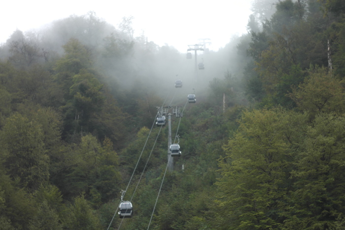 А тем временем, после завтрака мы поехали на Розу Хутор с целью подняться на Розу Пик и посетить парк водопадов Менделиха. Погода испортилась, пошел дождь и весь мы были под дождем с маленькими перерывами. Поднялись на канатной дороге до самой вершины, но ничего кроме густого тумана из туч мы не увидели. К слову, цена за поездку на канатке 1590р на одного, мне показалось это дороговато - 1000р на мой взгляд оптимальная цена за сей мероприятие. И тем не менее мы поднялись на пик, в парк водопадов не попали, так как из-за погоды открытую канатку ведущую в парк закрыли. Мы спустились в Олимпийскую деревню и как раз дождь закончился, мы успели какое-то время погулять, пофоткаться, посмотреть на облака и горы, деревню. Там мило, там красиво. Но снова влил дождь и мы решили спуститься вниз и догулять оставшееся время там. Следующий день мы планировали провести на экскурсии в Абхазии, главной целью которой - Гегский водопад.