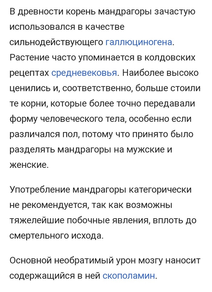 Когда-то корню мандрагоры приписывали настолько сильные колдовские свойства, что за хранение этого растения была положена смертная казнь. Однако тяга к быстрому обогащению или исцелению оказывалась сильнее страха смерти.