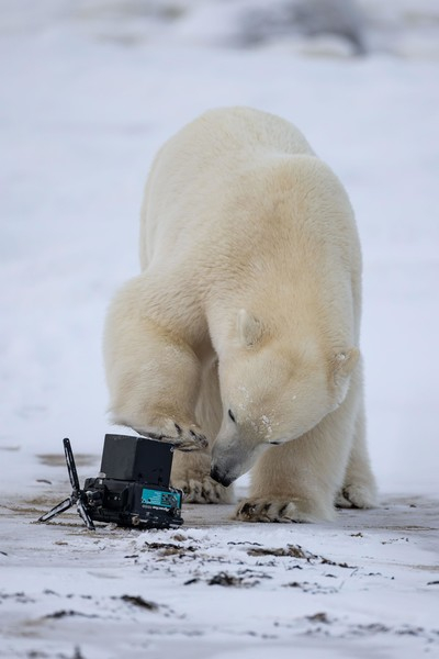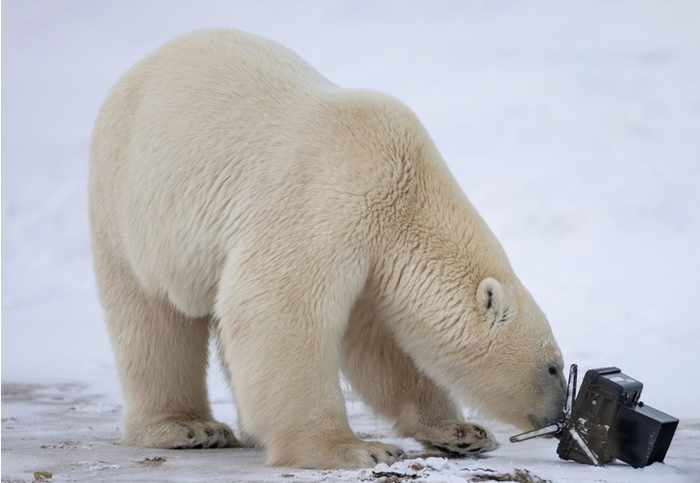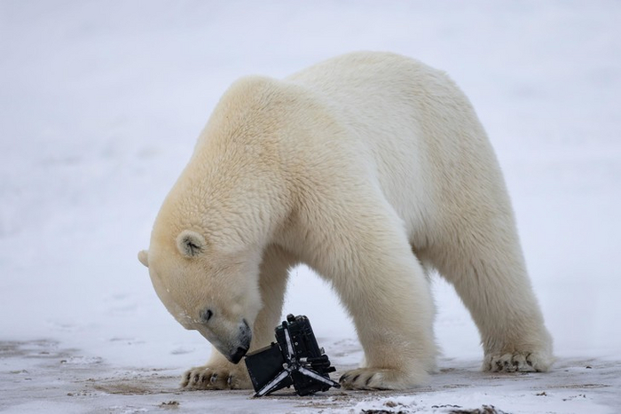 Канада, провинция Манитоба, Черчилл. Профессиональный фотограф-натуралист Лейтон Лам едва не лишился одной из своих камер, когда устройство для автономной съёмки привлекло внимание любопытного белого медведя. Но в итоге могучий зверь всего лишь опрокинул фотоаппарат.