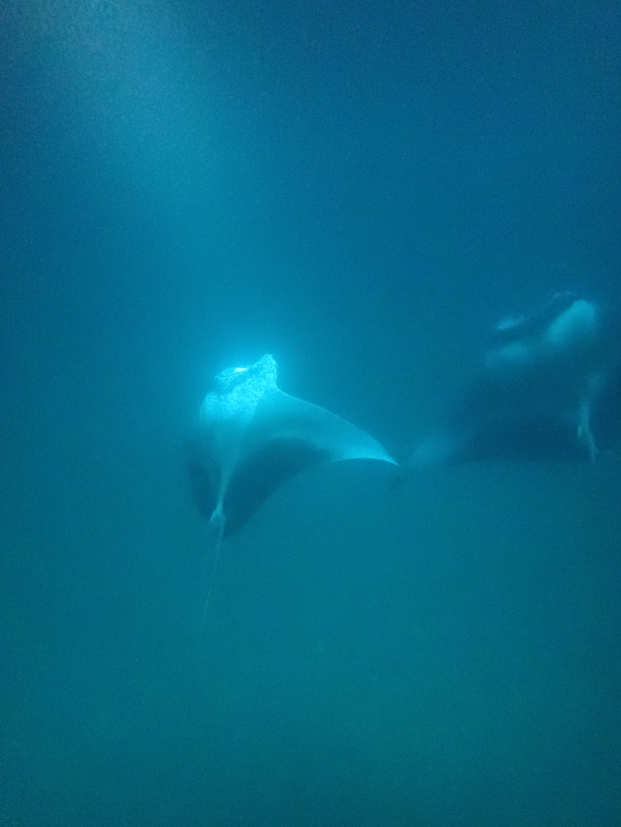 Примадонна, то есть манта, не спешит. Дайверы в ее отсутствие развлекают себя пусканием пузырей, плаванием взад-назад или сами изображает манту.