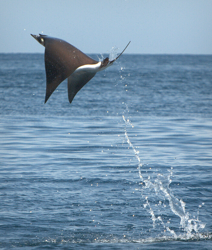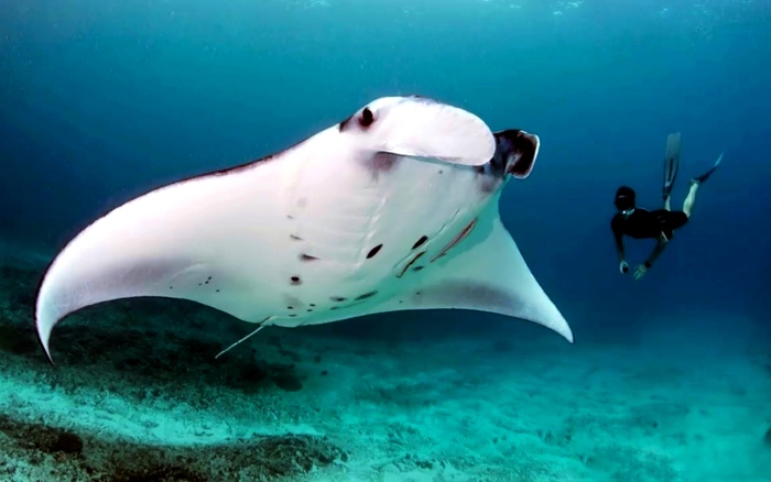 А на самом деле морской дьявол – одно из безопаснейших существ. Нет ни шипов, ни электричества, ни жутких зубов, удлиненный хвост-плеть ничем не вооружен. И характер незлобный, даже добродушный. На людей не нападают вообще. Да и двигается манта грациозно, неторопливо, даже флегматично, скорее – парит, летит, машет крыльями. Завораживающее зрелище…