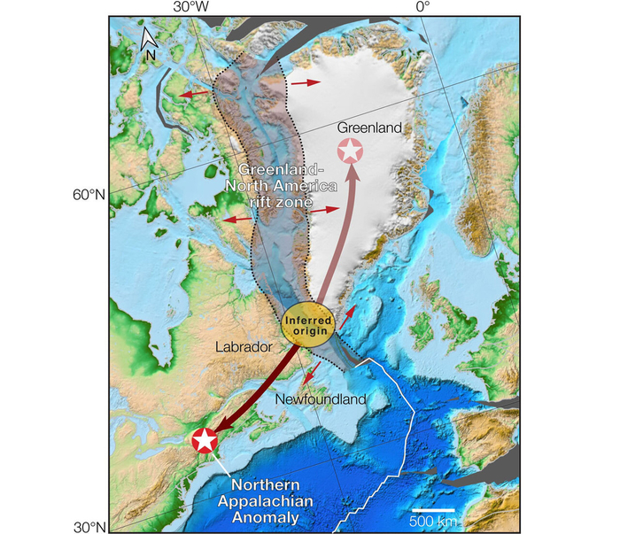 NAA может быть частью более масштабной цепочки. Южнее расположена Центральная Аппалачская аномалия (CAA), возможно, представляющая более раннюю «каплю», связанную с началом раскола Лабрадорского моря 135 млн лет назад.