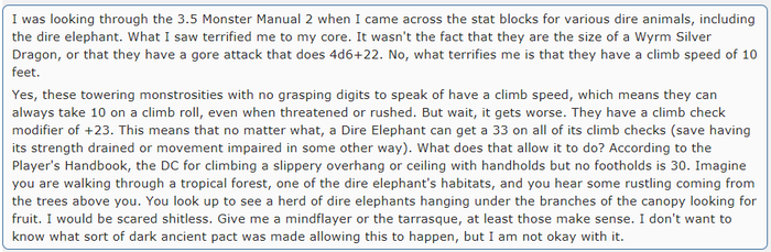 Что же все вышеперечисленное позволит ему проделывать? Согласно книге игрока, DC для лáзанья по скользким выступам или потолку с выступами для рук, но без опоры для ног, равна 30. Представьте себе, вы идете через тропический лес, одно из мест обитания жутких слонов и начинаете слышать какое-то шуршание исходящее с дерева над вами. Вы поднимаете взгляд, чтобы увидеть стадо жутких слонов раскачивающихся под навесом из веток в поиске фруктов. Я был бы напуган до усрачки. Дайте мне иллитида или Тараска, в них хотя бы есть какой-то смысл. Я не желаю знать, что за древний темный пакт был заключен для того, чтобы позволить этому случиться, но я с этим не согласен.