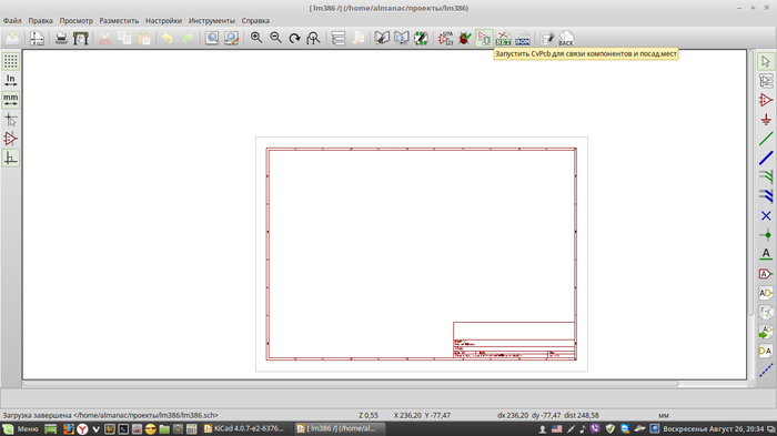 Подключим библиотеки посадочных мест. Для этого ищем среди картинок в меню ту, что с подписью "Запустить CvPCB для связи компонентов и пос. мест" (Для запущенных случаев: значок состоит из красного треугольника и черного прямоугольника).