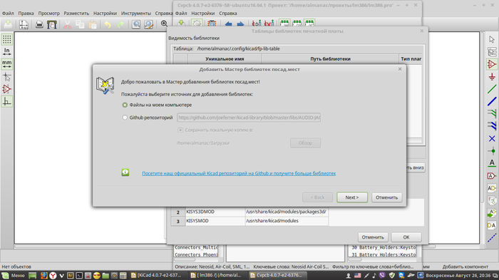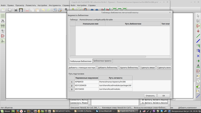 Доброго времени суток. Недавно столкнулся с такой проблемой: на Windows программа KiCAD (если кто не знает, это программа для разработки электрических схем и печатных плат) работает, как говорят, из коробки, а в Linux при первом открытии нет ни библиотек, ни каталога посадочных мест, даже просмоторщик 3D и тот не работает. Облазил все форумы, писал в сообщество в Telegram, но решения или инструкции никто не смог предоставить. Загляну на Youtube, но там все примеры как раз в Windows. Пришлось копаться самому и после нескольких часов/дней мучений решение было найдено, о чем и хочу поделиться. Данный мануал сделан на KiCAD версии 4. Существует уже и пятая, но я там особо не лазил.