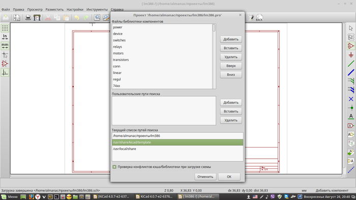 В поле "Пользовательские пути поиска" выбираем путь : .../usr/share/kiсad/modules/library/ и перезагружаем KiCAD.