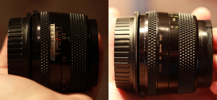 Кольцо фокусировки тугое (я до сих пор не смазал объектив) и располагается не совсем удобно, близко к креплению объектива к тушке, люфта нет.
