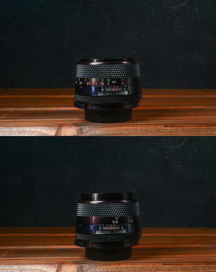 Оптическая схема 4 элемента в 3 группах, 20 лепестков диафрагмы, МДФ 1,5м, резьба под светофильтры 49мм. При вращении кольца фокусировки объектив несколько удлиняется, при этом передняя линза не вращается.