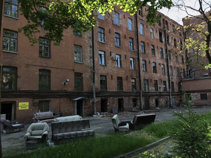 Прошли. Первое, что мне бросилось в глаза: на улице стояла мебель, местами грязная, черная, в копоти.