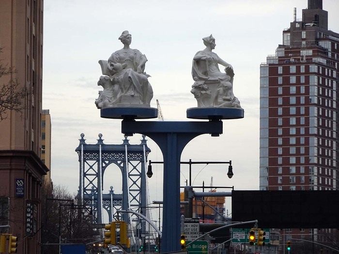 Манхэттенский мост самый архитектурно-насыщенный, читай нарядный, чем любой другой мост в городе. Арка украшена скульптурным панно Карла Августа Хебера с аллегорическими изображениями «Духа торговли» и «Духа промышленности». Сверху на арке изображена работа другого скульптора – Чарльза Керри Рамси, где инсценирована охота индейцев на бизона. С противоположной стороны, на пьедесталах, были установлены фигуры женщин, олицетворяющих Манхэттен и Бруклин, выполненные скульптором Даниэлем Честером Френчем, создавшим знаменитую огромную статую Вашингтона. Но в 60-х годах женские статуи были перенесены в Бруклинский музей. Взамен на мачте установили уменьшенные копии.