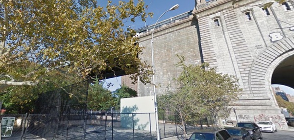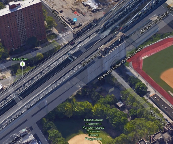 Итак, перед нами не что иное, как легендарный Манхэттенский мост. Изучив его с обеих сторон, выясняем, что подпись на фотографии указана неправильно - спортплощадка находится не на Питт-Стрит, а на Черри-стрит.
