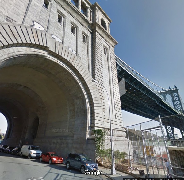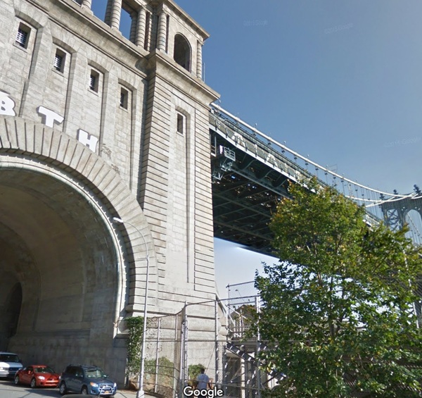 Фото датировано 1947 годом и подписано "Нью-Йорк, Питт-стрит". Мне стало интересно - а как выглядит это место спустя более чем 60 лет? Неоценимый помощник в этом деле - Гугл-карты. Однако, прошерстив Питт-стрит вдоль и поперёк, ничего схожего я на обнаружил. Тупик? Нет - тому, кто знает нью-йоркские мосты "в лицо", это не помеха.