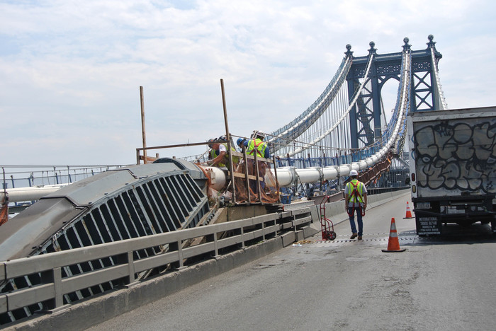 В 1978 году инженеры осматривая Манхэттенский мост обнаружили растрескивания и коррозии. Дальнейшее расследование показало, что растрескивание происходит на подвесных конструкциях ферм. Прохождение даже одного поезда вызвало микроскопические трещины развивающиеся в течение десятилетий. В довершении, коррозия была обнаружена в одном из четырех основных тросов. Проект долгосрочной реконструкции также включал капитальный ремонт подвесных структур, которые несут четыре дорожки метро. В западном направлении трассы были закрыты в период между 1985 и 1988 годами, в то время как в восточном пути были закрыты в период между 1988 и 2004.