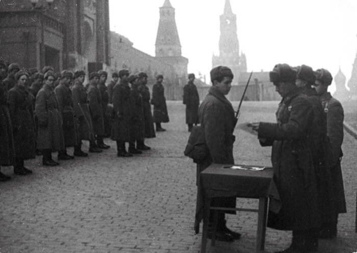 15. Бойцы Красной Армии принимают военную присягу на Красной площади перед отправкой на фронт. Кадр из документального фильма "Разгром немецких войск под Москвой" производства Центральной студии кинохроники. Первый советский фильм, получивший премию Американской киноакадемии "Оскар". Москва, ноябрь 1941 года.