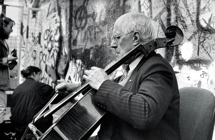 14. Мстислав Ростропович исполняет произведения Баха на контрольно-пропускном пункте "Чарли" после открытия границ между ГДР и ФРГ. Ноябрь 1989 года.