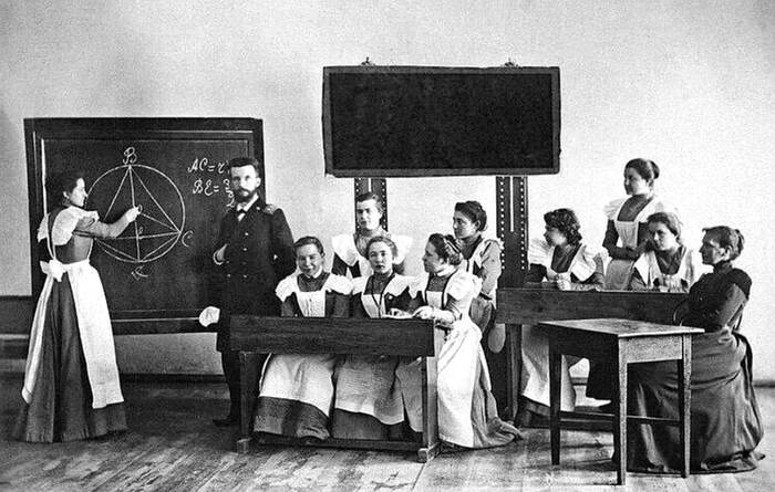 16. Урок геометрии в женской гимназии г. Серпухова. Учитель стоит у доски, а за столом справа - госпожа наставница, следящая за порядком и поведением учениц на уроке. Россия, 1905 год.